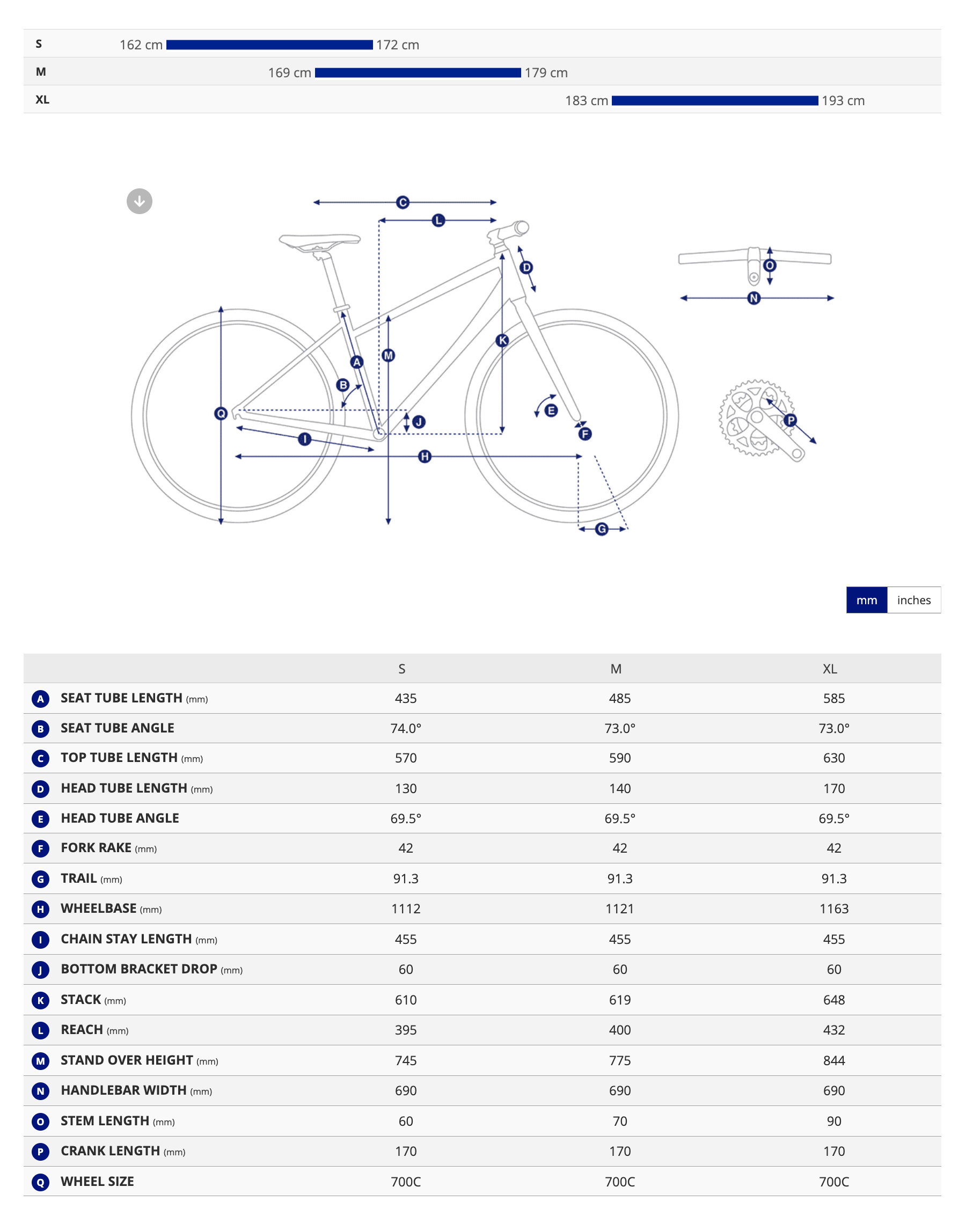 S: 162–172 cm | M: 169–179 cm | L: 176–186 cm | XL: 183–193 cm