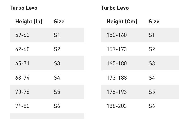 S1: 155–165 cm | S2: 158–173 cm | S3: 165–180 cm | S4: 173–188 cm | S5: 180–198 cm | S6: 193–205 cm